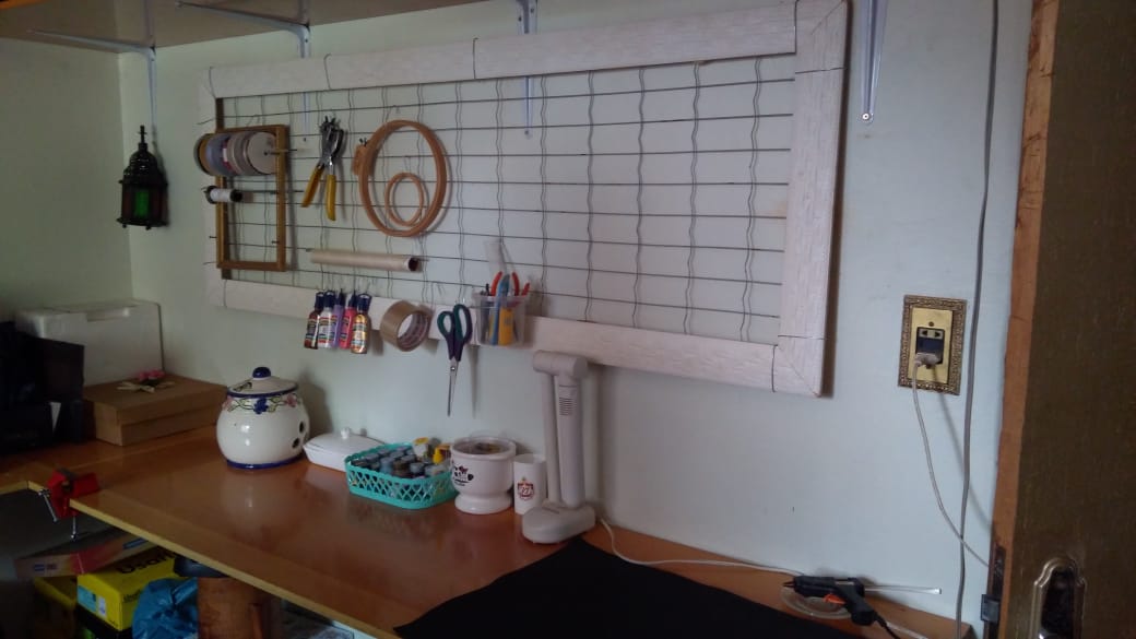 Para fazer a parte do painel eu tive que adaptar, eu não tinha esta chapa eucatex perfurada, então fui até a oficina do meu pai e peguei um pedaço de grade feita de arame que estava por lá para fazer o fundo do meu organizador. Sim eu sei que é bem diferente desta chapa eucatex, mas preferi utilizar o que já tinha em casa. Assim eu medi a grade para o tamanho da moldura e cortei com um alicate.